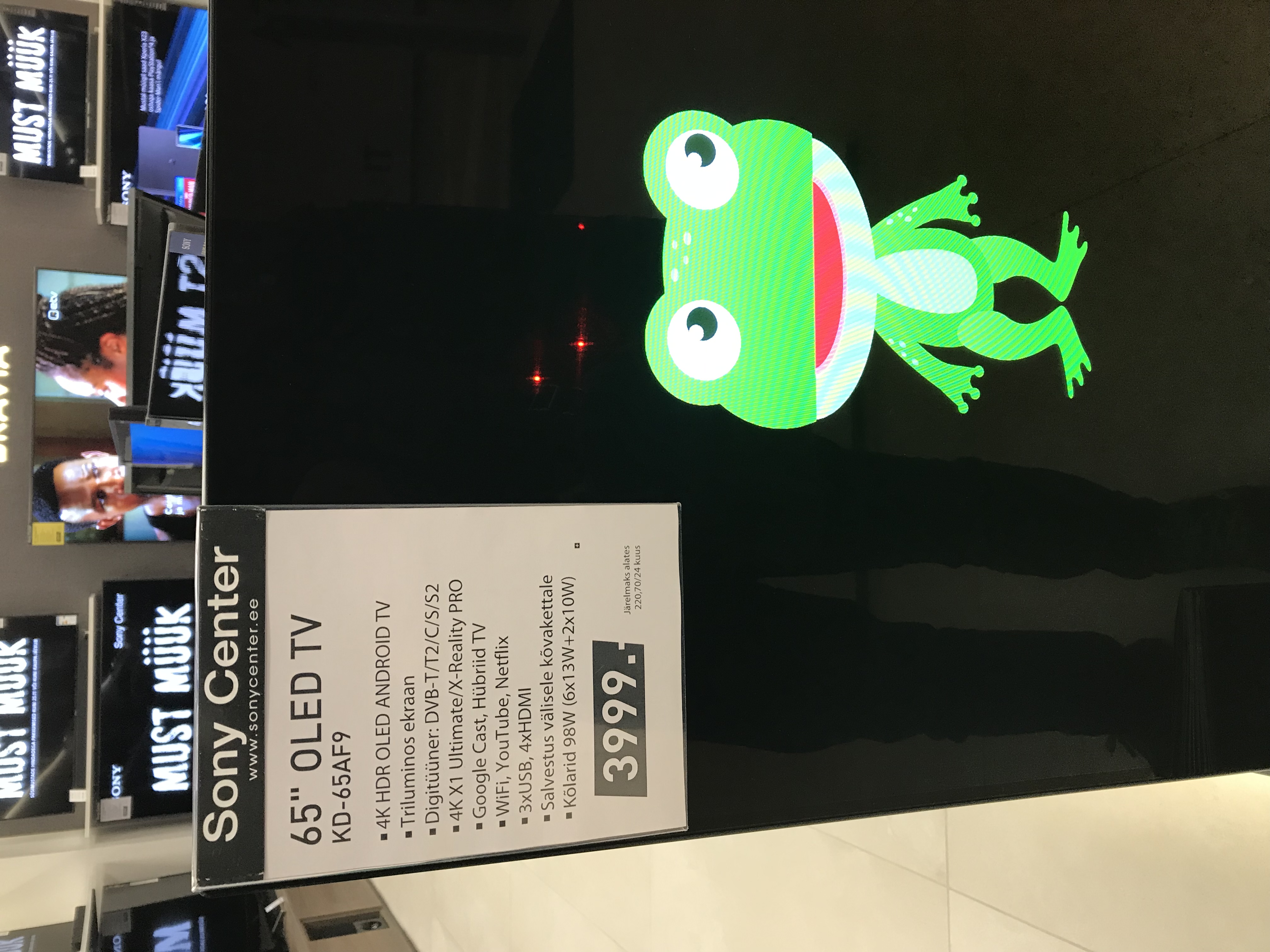 0000 kirjutas:Käisime täna uues T1 kaubanduskeskuses, kus on ka Sony väljas. AF9 on see midel, mida vajad! Ja sellest on olemas lisaks 65” mudelile ka 55”. Vot seda peaksid praegu kaaluma ja hind on ka üsna OK. Ostab selle ju pea kogu eluks!? (Pildikast ei ole küll koht, kust koonerdada).