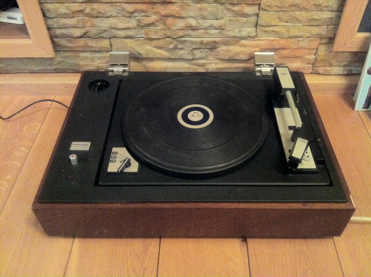 Tõin vanemate juurest ära oma 15-20 aastat seisnud (kütmata ruumis) nõukaaegse vinüülplaadimängija Melodija 104 stereo. Korpus oli liimist lahti, selle sain korda. Samuti on korras mootor. Häda on selles, et häält ainult ei saa kuidagi sellist heliväljundist kätte. Nõel on küll vana ja väsinud, kuid töötab. Vähamalt kui plaat käima panna, siis lähedalt kuulates on heli kuulda, kuid jah heliväljundist mina seda kätte ei saa. Või siis ma ei peagi sealt heli kätte saama tänapäeva resiiverisse?