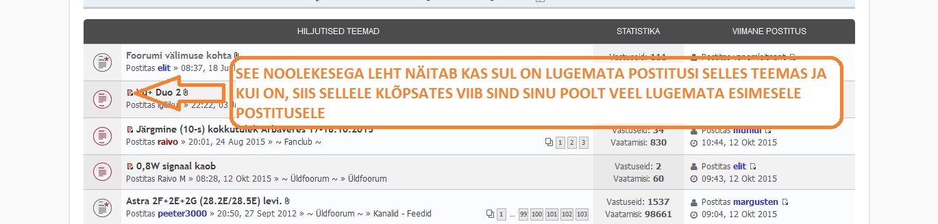 mustkass kirjutas:Sa sombi ei saanud vist aru kui avad postituse avalehelt siis pead kohe valima viimase lehekülje näiteks 259 vastasel korral kui lihtsalt sisened postitusse mida lugeda toob ta sulle ette esimese lehekülje mida sul vaja ju pole ja sealt edasi valides lehekülje numbri saad viimase postituse mis on märgitud numbriliselt vanas foorumis avasid postituse ja automaatselt näitas ta sul uut postitust enamgi veel ta viis sind automaatlselt ka uue postituse lehe lõppu,üldkokkuvõttes on ju see kõige tähtsam et saaksid kergema vaevaga uusi postituse kohe lugeda aga nii siin enam ei saa ja sellest on paganama kahju...