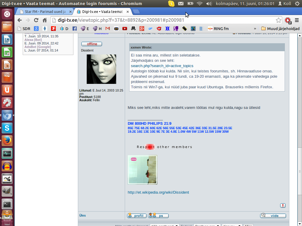 Kui FF toimib, siis on viga kroomis. Vist? Vahet pole, kas XP ja Chrome või praegune Ubuntu 12.04 ja Chromium, probleem on sama, 9-tundi ja väljas. Vaadake pilti (järjehoidja riba). Ainus, millel autologin ei tööta, on käesolev foorum ja vahet pole, millise arvutiga netis käin (Neid on mul mitu). Juba paar aastat on see jama, aga ma olen sellega harjunud.