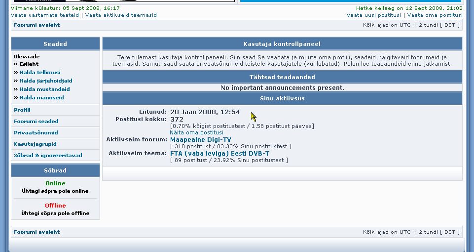 Vaatasin nüüd minagi, et olen "kasutaja kontrollpaneeli" andmetel viimati foorumis olnud: "Aug 21, 2008 7:45 pm"